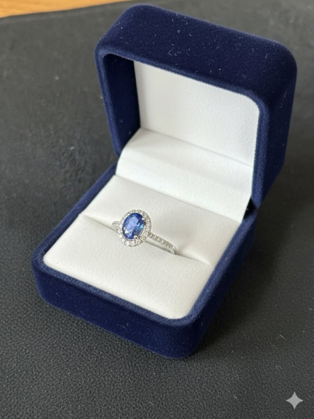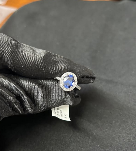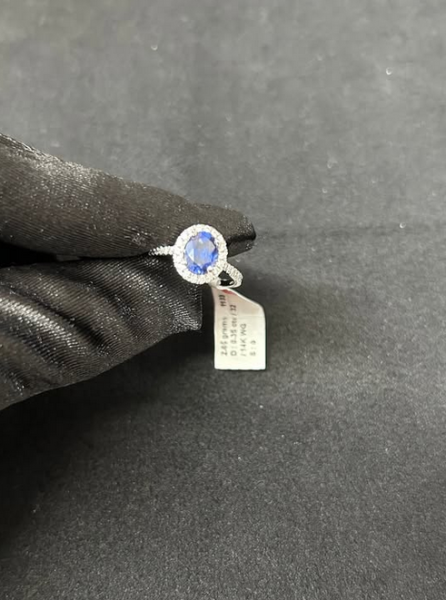 This ring is a real showstopper. It's got a vibrant blue sapphire right in the middle, surrounded by a stunning halo of diamonds. The 14k gold band has more diamonds going halfway around it, so it catches the light from every single angle. It feels solid and high-quality at 2.65 grams, and it's a size 7. Whether you're getting engaged, celebrating an anniversary, or just want to treat yourself, this ring is absolutely perfect. Key Features Center Stone: Blue Sapphire Metal: 14k Gold Accent Stones: Lab-Grown Ring Weight: 2.65 grams Ring Size: 7 Setting Style: Halo and Half-Eternity Band