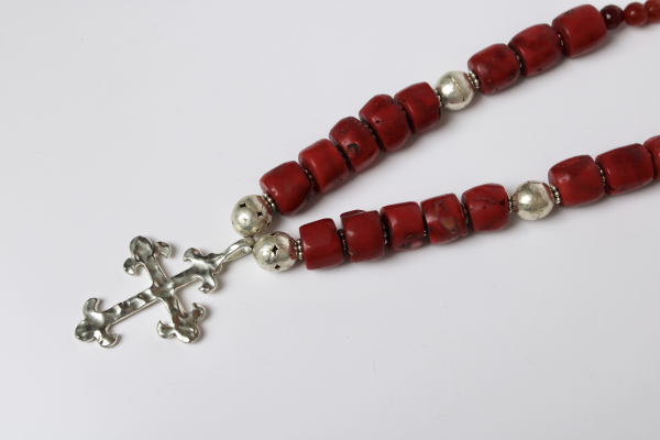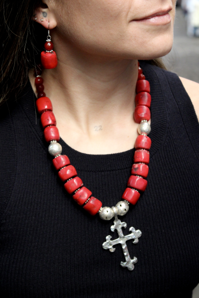 This handcrafted statement necklace is made with deep red coral cylinder beads, symbolizing life, devotion, and ancestral strength. At its center hangs a baroque-style cross crafted in pewter with a silver-plated finish, adding a timeless and sacred presence to the piece